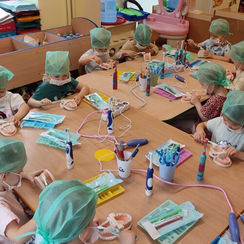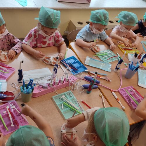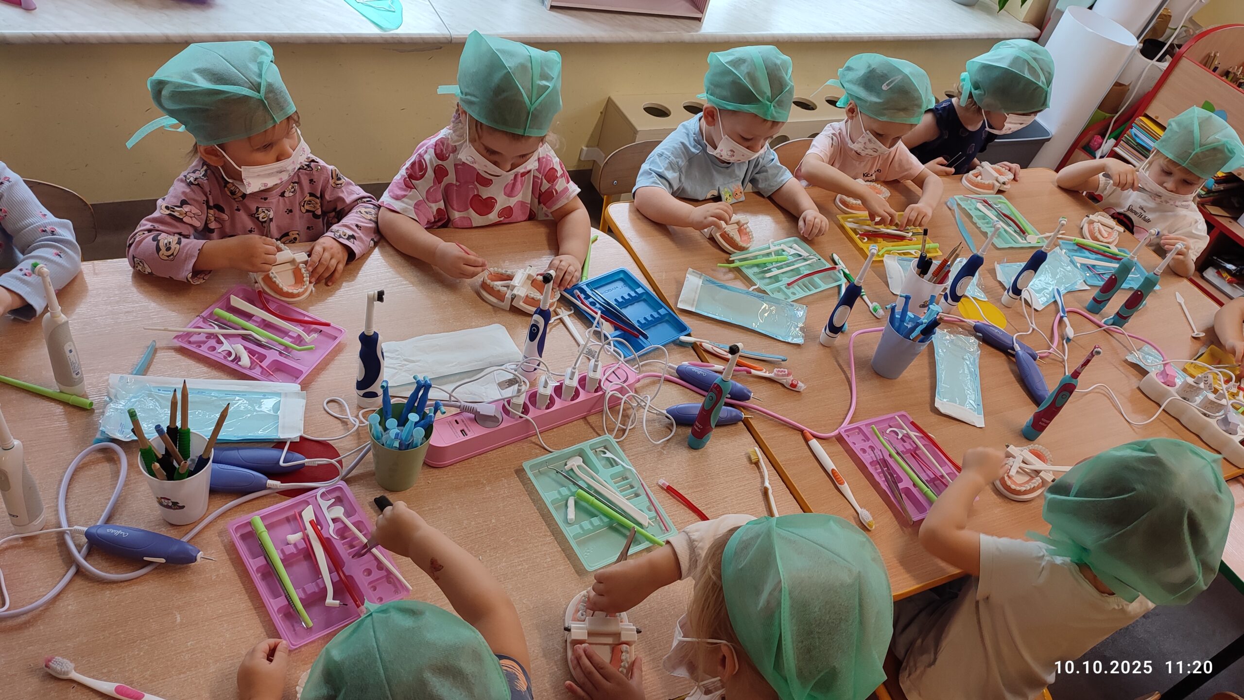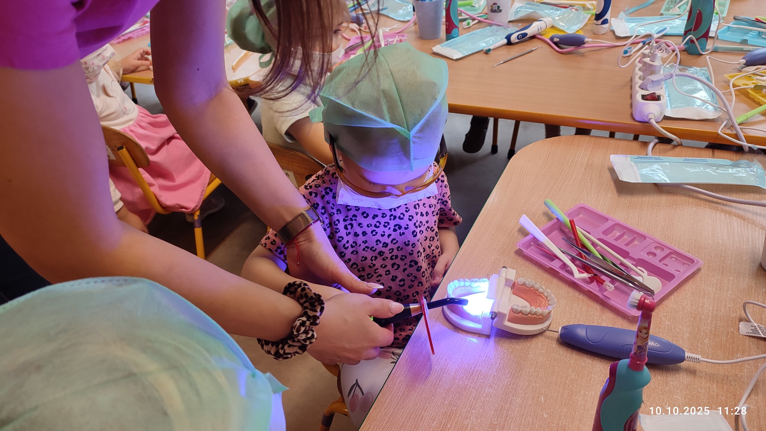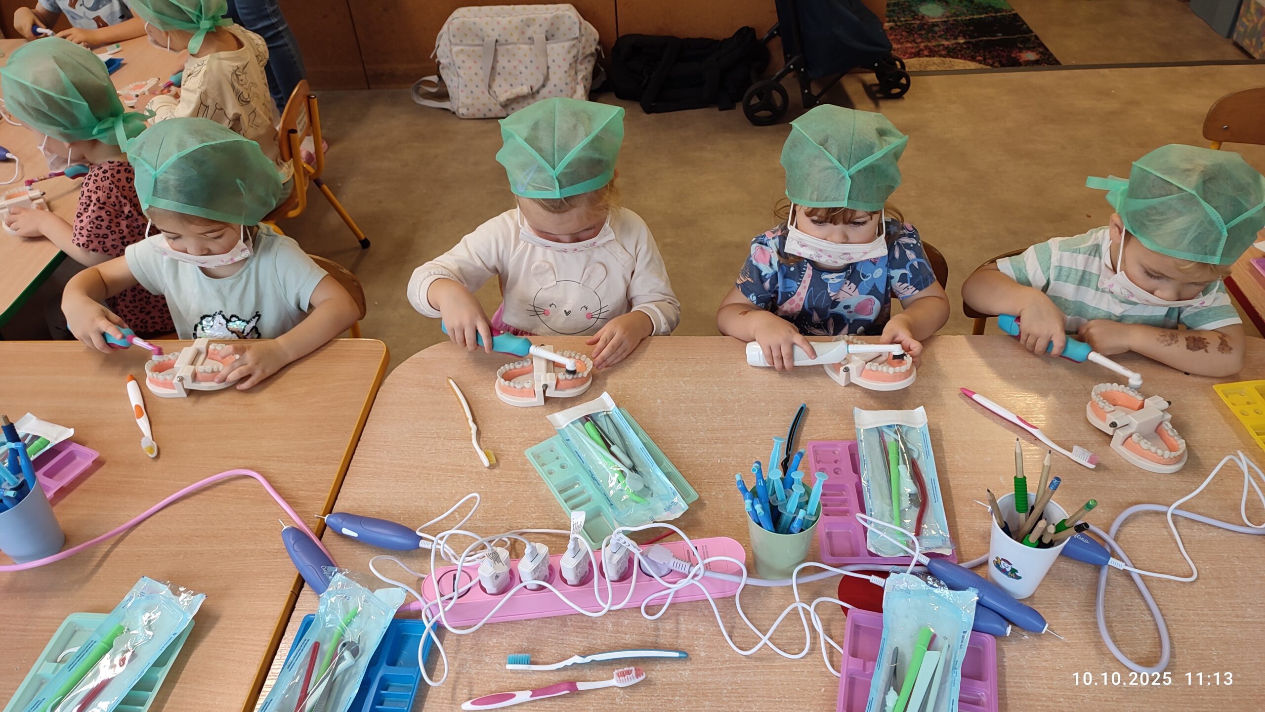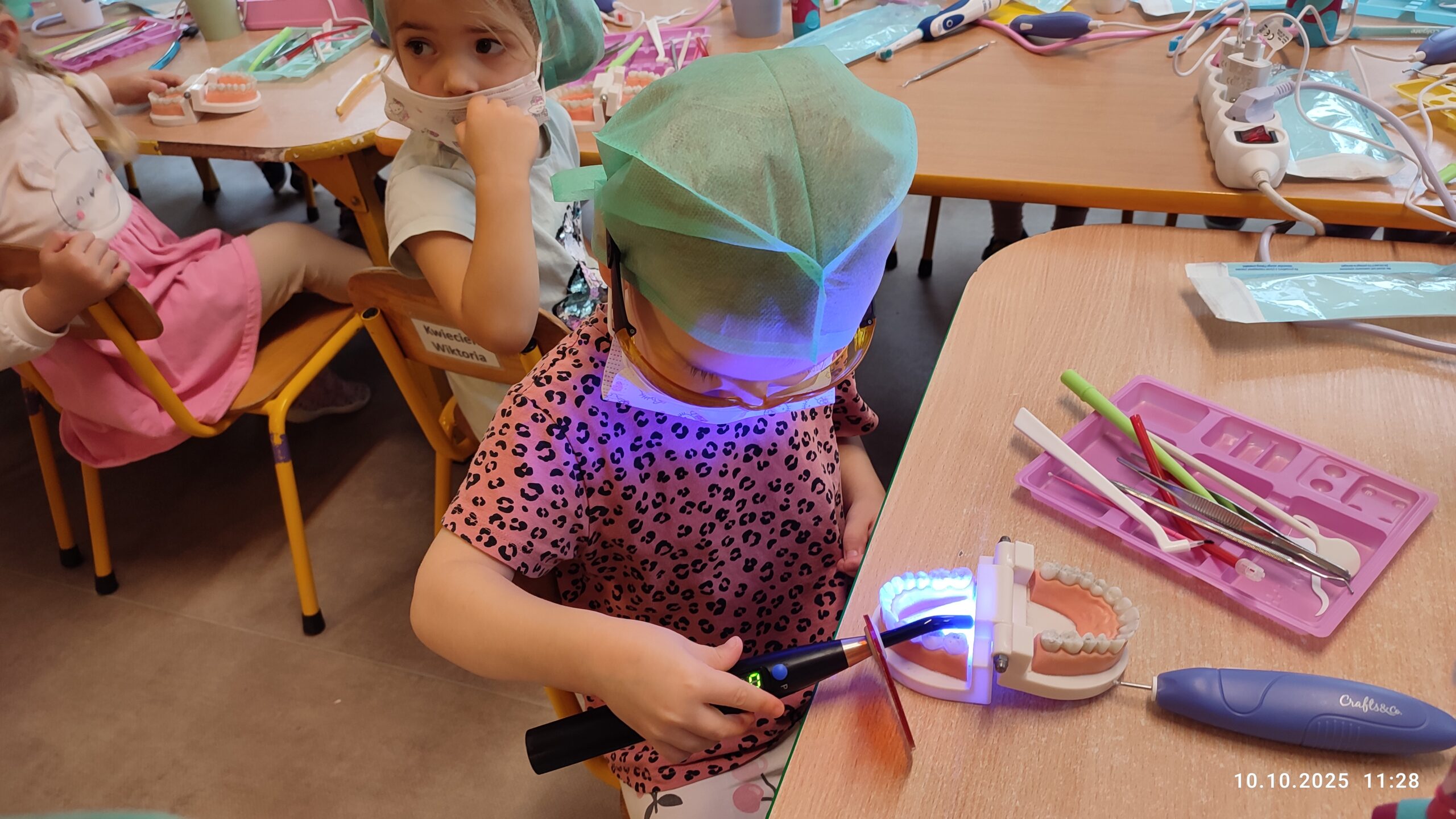 Dzisiaj odbyły się warsztaty stomatologiczne „Smok Bartek u dentysty”. Przeprowadziła je pani Diana wraz ze Smokiem Bartkiem. Warsztaty te miały na celu przełamanie strachu przed dentystą, naukę prawidłowej higieny jamy ustnej oraz zapoznanie z zawodem stomatologa. Pani Diana rozmawiała z przedszkolakami na temat zdrowego odżywiania się, które ma pozytywny wpływ na zdrowe zęby i zgubnych skutków jedzenia słodyczy, powodujących próchnicę. Następnie, po zapoznaniu dzieci z materiałami i sprzętem dentystycznym, każdy przedszkolak mógł poczuć się jak prawdziwy stomatolog – miał możliwość poćwiczyć na modelu szczęki szczotkowanie zębów oraz zakładanie i utwardzanie plomby. Po zaliczeniu praktycznego treningu, wszystkie przedszkolaki w nagrodę otrzymały dyplomy i niespodzianki, które mają im przypominać o codziennym dbaniu o swoje zęby i systematycznych wizytach kontrolnych u dentysty.