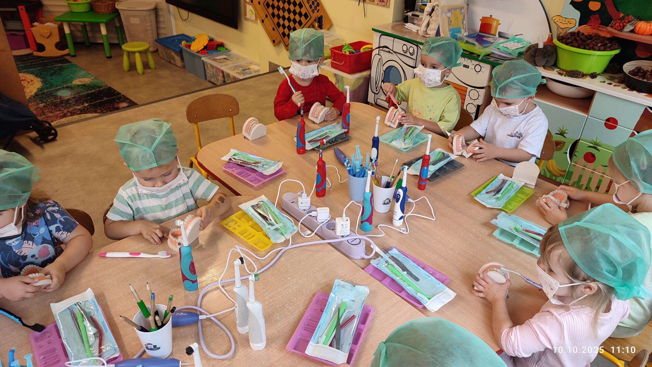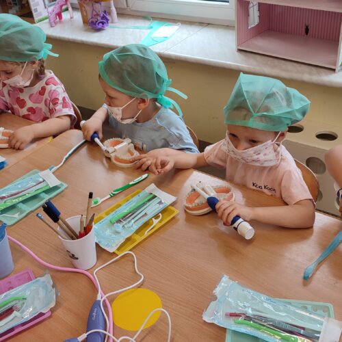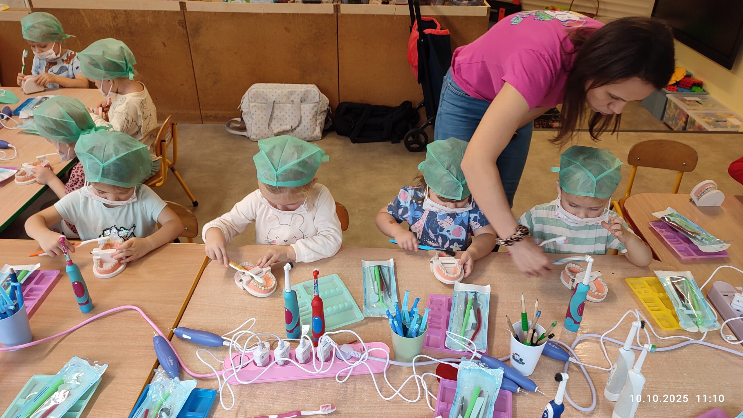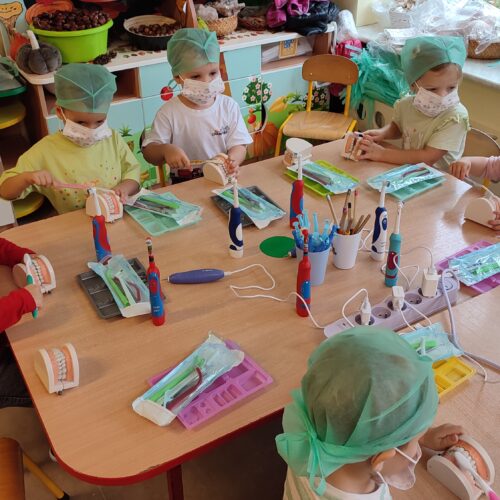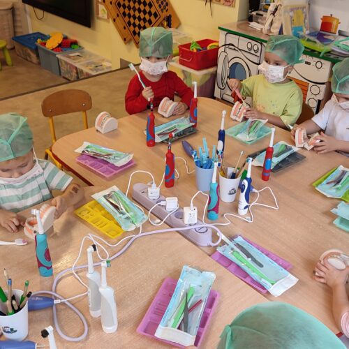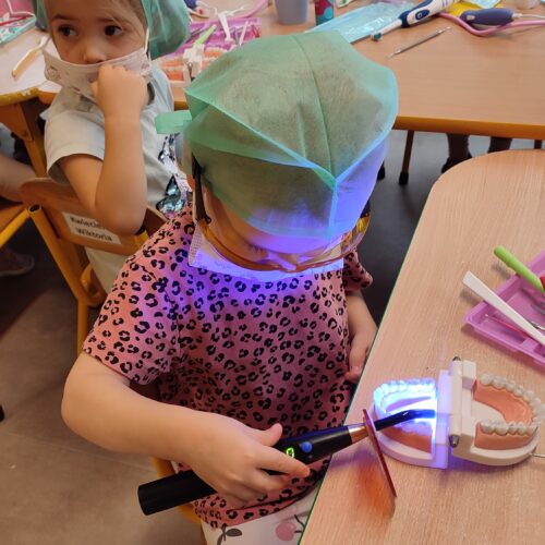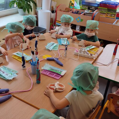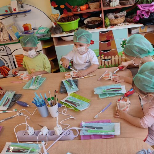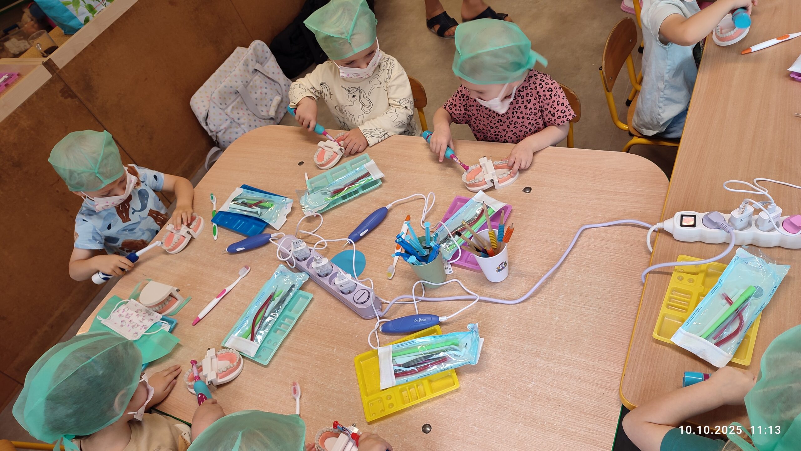 Dzisiaj odbyły się warsztaty stomatologiczne „Smok Bartek u dentysty”. Przeprowadziła je pani Diana wraz ze Smokiem Bartkiem. Warsztaty te miały na celu przełamanie strachu przed dentystą, naukę prawidłowej higieny jamy ustnej oraz zapoznanie z zawodem stomatologa. Pani Diana rozmawiała z przedszkolakami na temat zdrowego odżywiania się, które ma pozytywny wpływ na zdrowe zęby i zgubnych skutków jedzenia słodyczy, powodujących próchnicę. Następnie, po zapoznaniu dzieci z materiałami i sprzętem dentystycznym, każdy przedszkolak mógł poczuć się jak prawdziwy stomatolog – miał możliwość poćwiczyć na modelu szczęki szczotkowanie zębów oraz zakładanie i utwardzanie plomby. Po zaliczeniu praktycznego treningu, wszystkie przedszkolaki w nagrodę otrzymały dyplomy i niespodzianki, które mają im przypominać o codziennym dbaniu o swoje zęby i systematycznych wizytach kontrolnych u dentysty.