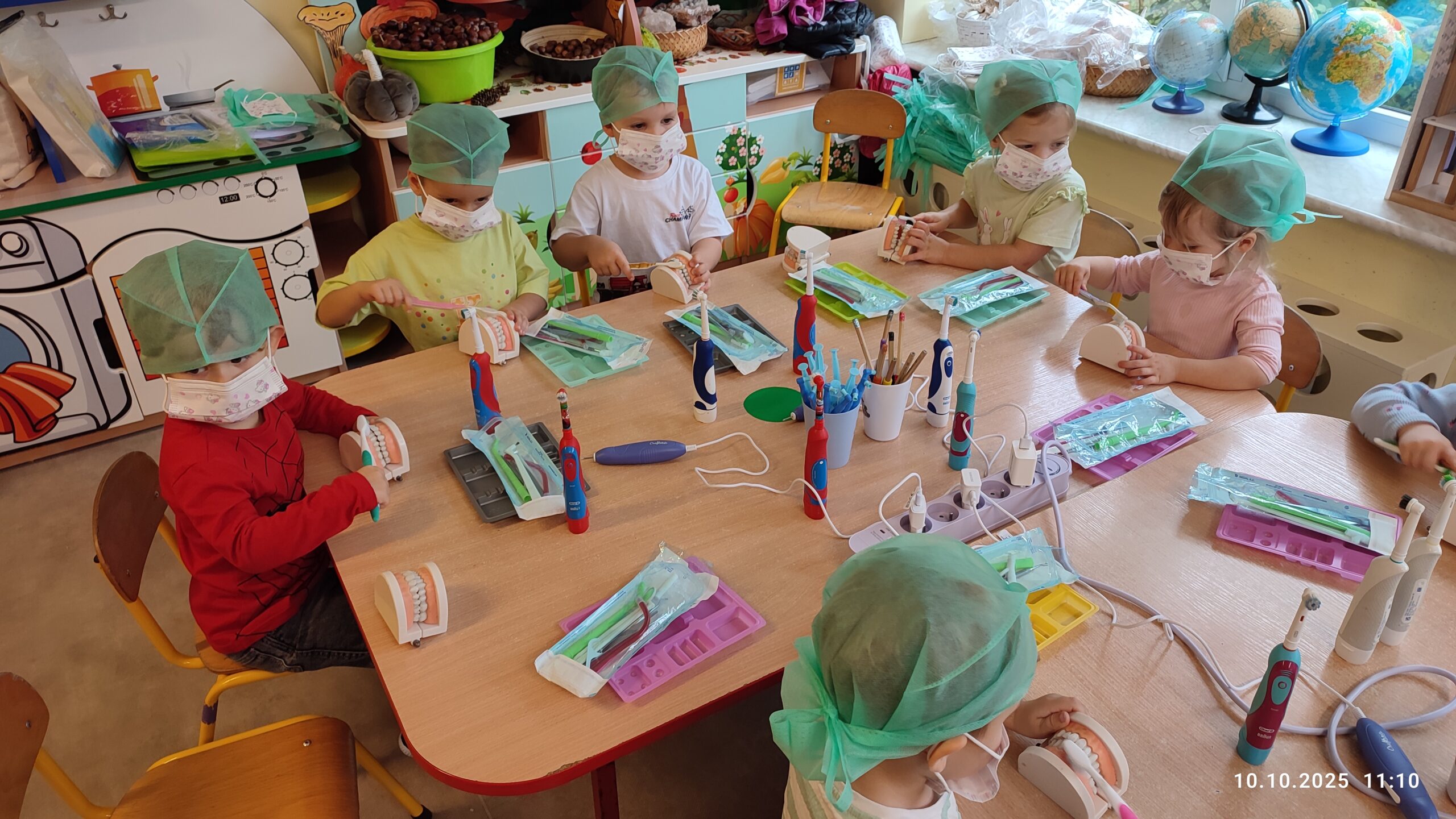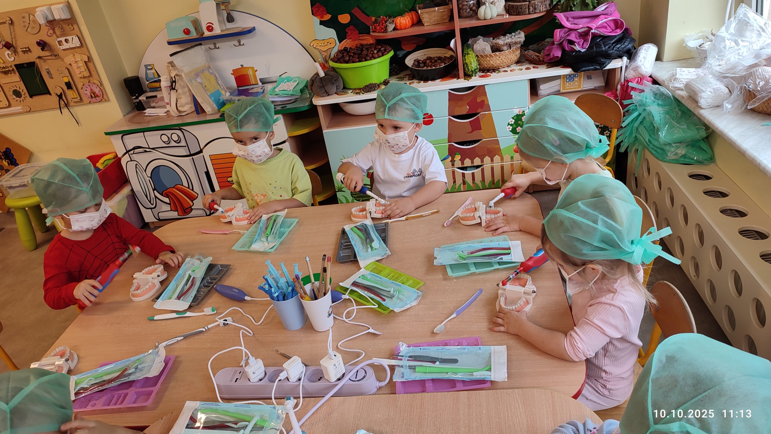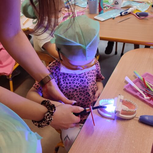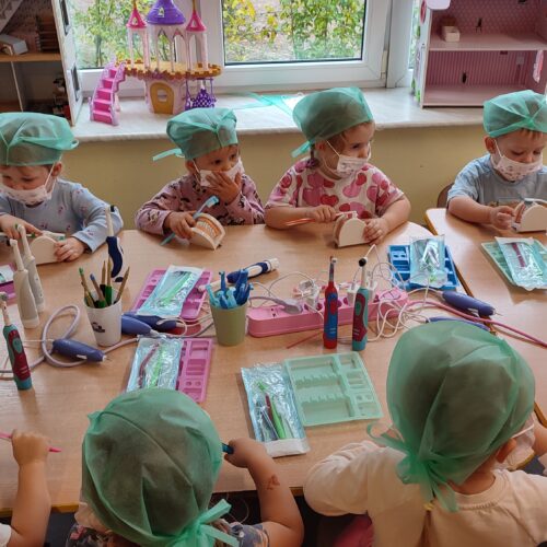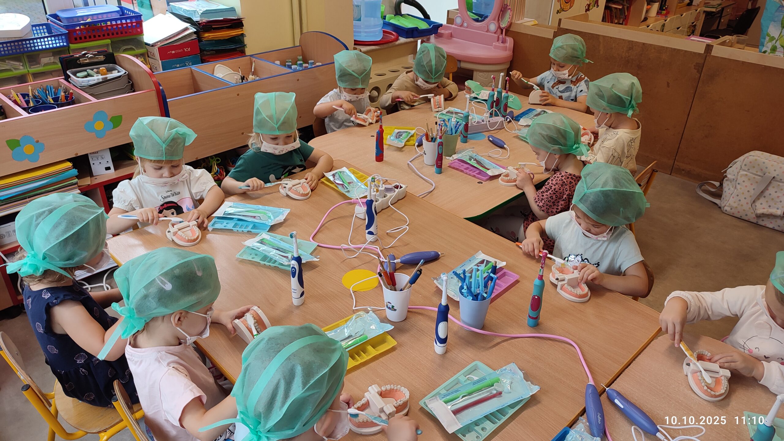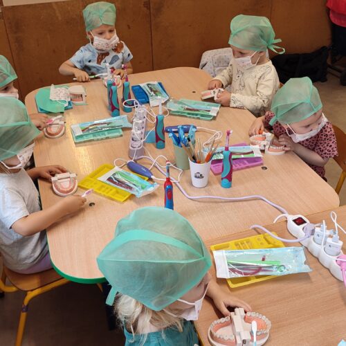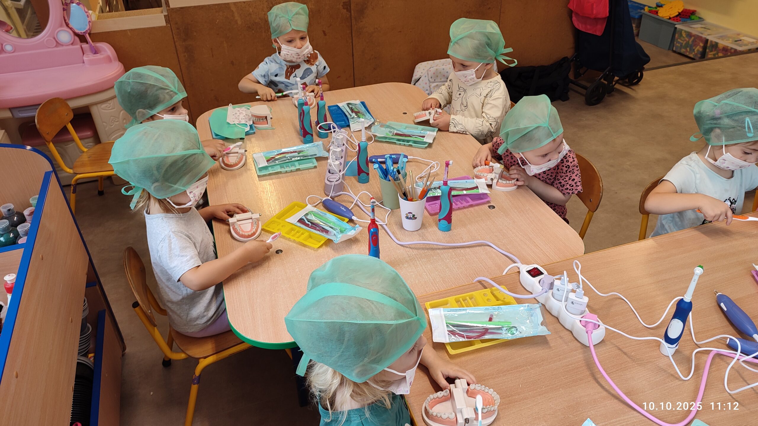 Dzisiaj odbyły się warsztaty stomatologiczne „Smok Bartek u dentysty”. Przeprowadziła je pani Diana wraz ze Smokiem Bartkiem. Warsztaty te miały na celu przełamanie strachu przed dentystą, naukę prawidłowej higieny jamy ustnej oraz zapoznanie z zawodem stomatologa. Pani Diana rozmawiała z przedszkolakami na temat zdrowego odżywiania się, które ma pozytywny wpływ na zdrowe zęby i zgubnych skutków jedzenia słodyczy, powodujących próchnicę. Następnie, po zapoznaniu dzieci z materiałami i sprzętem dentystycznym, każdy przedszkolak mógł poczuć się jak prawdziwy stomatolog – miał możliwość poćwiczyć na modelu szczęki szczotkowanie zębów oraz zakładanie i utwardzanie plomby. Po zaliczeniu praktycznego treningu, wszystkie przedszkolaki w nagrodę otrzymały dyplomy i niespodzianki, które mają im przypominać o codziennym dbaniu o swoje zęby i systematycznych wizytach kontrolnych u dentysty.