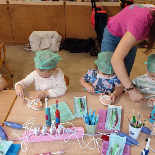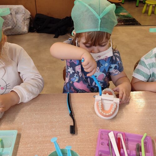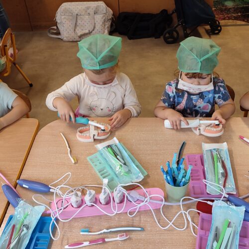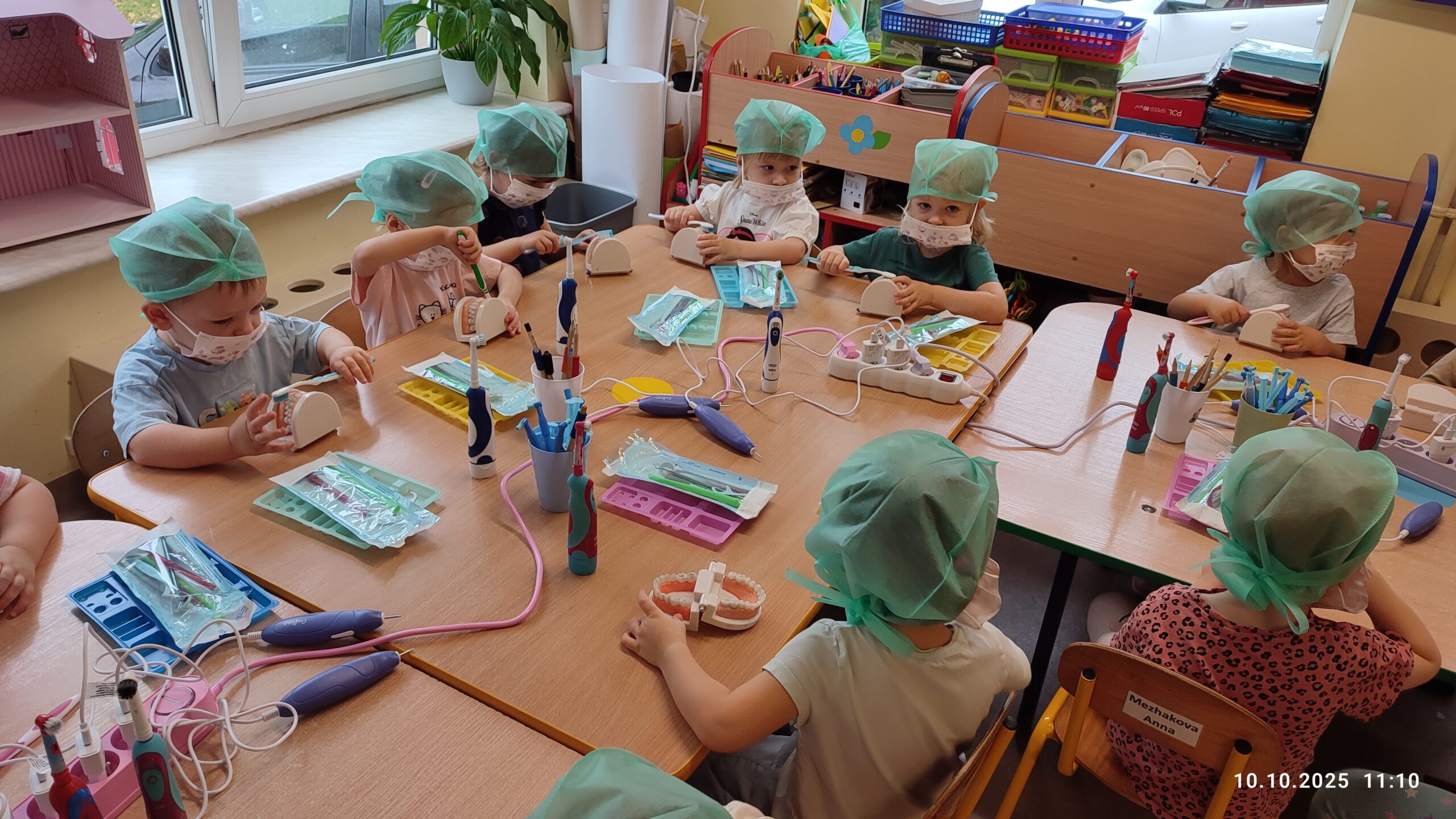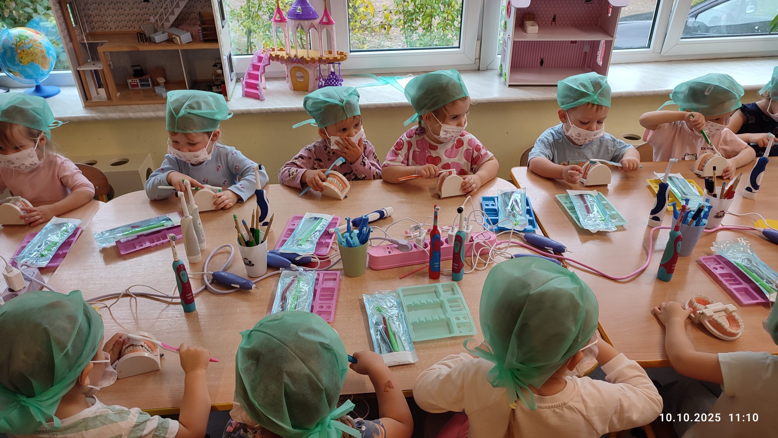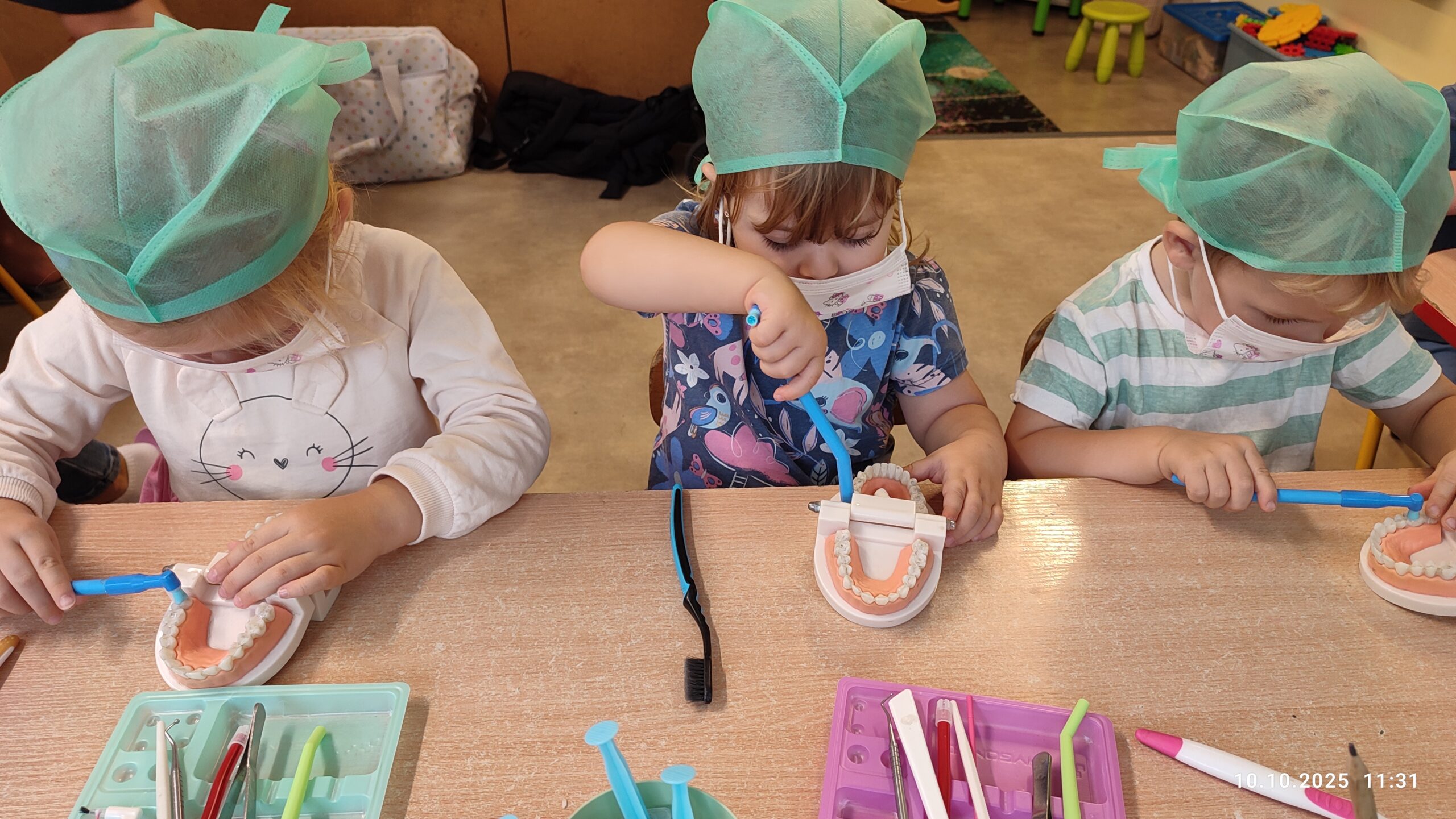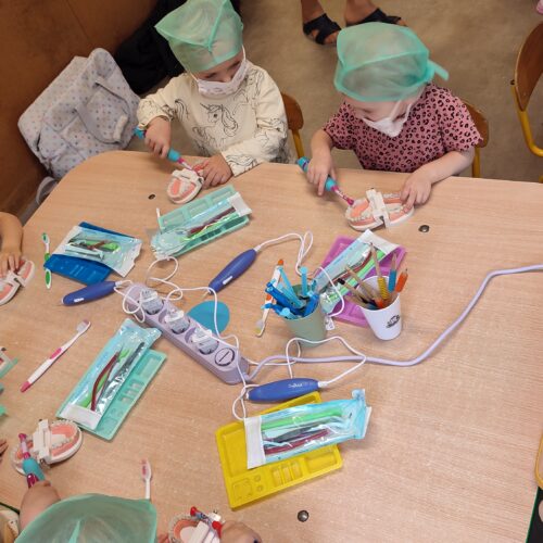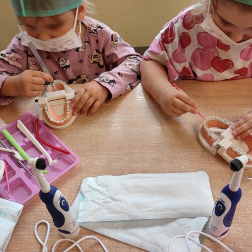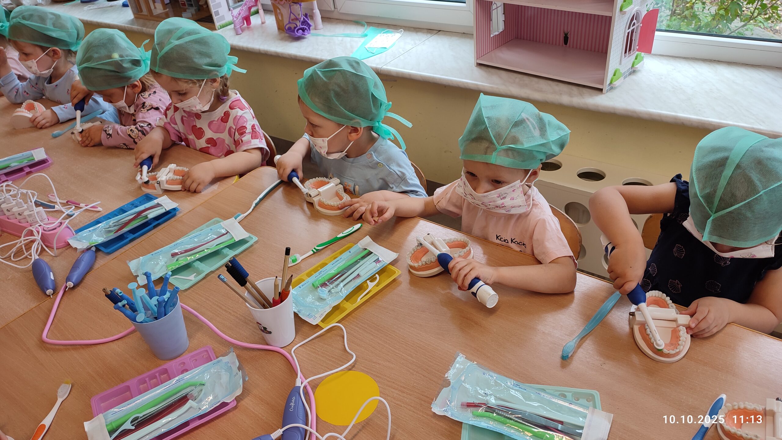 Dzisiaj odbyły się warsztaty stomatologiczne „Smok Bartek u dentysty”. Przeprowadziła je pani Diana wraz ze Smokiem Bartkiem. Warsztaty te miały na celu przełamanie strachu przed dentystą, naukę prawidłowej higieny jamy ustnej oraz zapoznanie z zawodem stomatologa. Pani Diana rozmawiała z przedszkolakami na temat zdrowego odżywiania się, które ma pozytywny wpływ na zdrowe zęby i zgubnych skutków jedzenia słodyczy, powodujących próchnicę. Następnie, po zapoznaniu dzieci z materiałami i sprzętem dentystycznym, każdy przedszkolak mógł poczuć się jak prawdziwy stomatolog – miał możliwość poćwiczyć na modelu szczęki szczotkowanie zębów oraz zakładanie i utwardzanie plomby. Po zaliczeniu praktycznego treningu, wszystkie przedszkolaki w nagrodę otrzymały dyplomy i niespodzianki, które mają im przypominać o codziennym dbaniu o swoje zęby i systematycznych wizytach kontrolnych u dentysty.