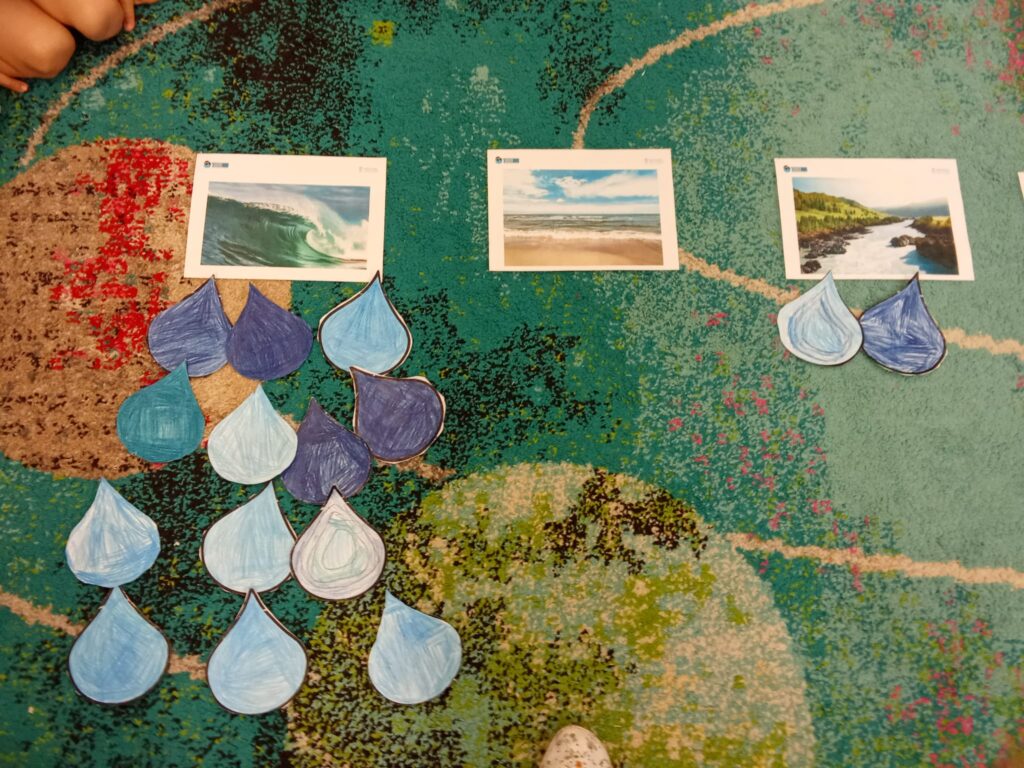 b) Gdzie jest woda? – zabawa dotykowa (woda w różnych postaciach)