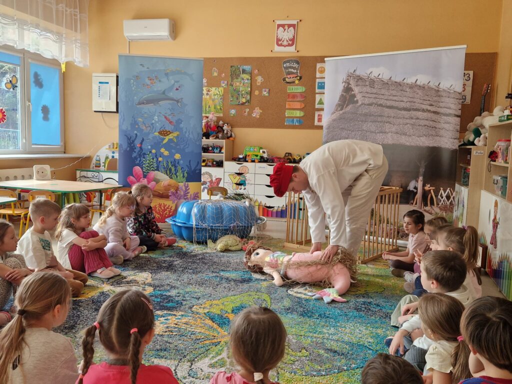 Dzisiaj dzieci z Granatowych Smoków odwiedziły gospodarstwo agroturystyczne „Wodne ogrody” gdzie piekły bułeczki, karmiły i głaskały zwierzęta: owce Belle, kozę Balladynę, psa Nele, konia Zorze, kaczki , kury, świnkę wietnamską Bolka i króliczka. Starczyło czasu na zajęcia plastyczne i zabawy na placu zabaw.